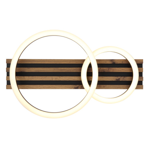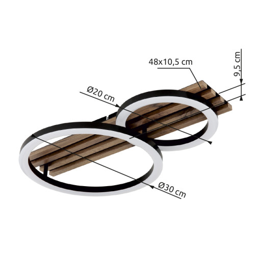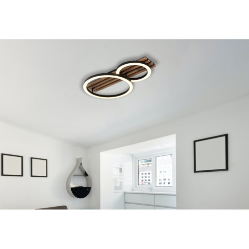 Modern LED ceiling lamp from the series Tisha, made of matt black colour rectangular metal base with MDF wooden elements and two matt black plastic rings with white plastic diffusers and built-in 18W 3000K LED. Original proposal for the interior lighting of your living room, dining room, bedroom, hallway, hotel and restaurant.