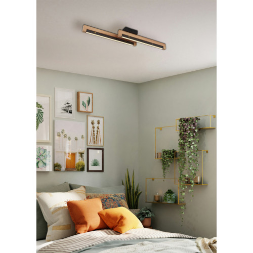 Original LED ceiling lamp from the series Starla, made of a black metal base and two bodies made of natural wood in combination with black matt aluminium and white plastic diffusers with built-in 12W 3000K LED. Modern lamp, suitable for lighting your living room, dining room, bedroom, office, hotel and restaurant.