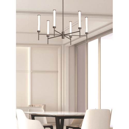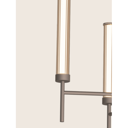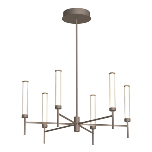 Stylish LED chandelier, made of a coffee colour metal base with arms and six cylindrical shades made of metal and clear glass with an acrylic diffuser and a built-in 46W, 3000K LED. The body has a dimmable TRIAC driver. Modern lamp, suitable for the quality and comfortable lighting of your living room, dining room, office, hotel and restaurant.