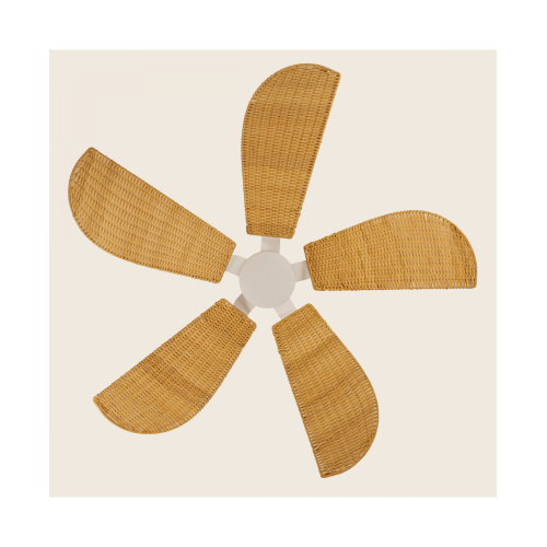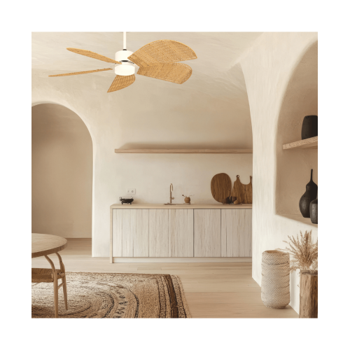 Modern LED ceiling fan with an original design, made of a white colour metal body with two down rods (12.5–25 cm) for height adjustment and five natural bamboo blades with a polycarbonate diffuser and a built-in 15W LED with a choice of colour temperature: 3000K/4000K/6500K. The set includes a remote control and a wall switch. The fan has a function: winter - summer and includes personalized time settings (1h, 2h or 4h). The body is equipped with a 45W DC motor with a noise level of 23 dB and offers six speed settings, providing effective airflow. Wonderful solution for your home, hotel and restaurant.