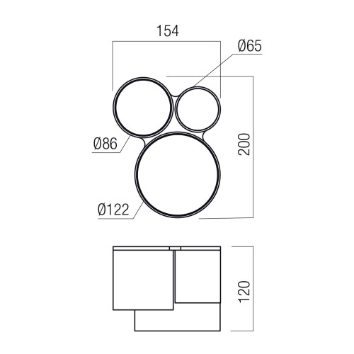 Dimensions: Height: 120mm, Length: 200mm, Width: 154mm, Diameter of the heads: 65mm, 86mm, 122mm