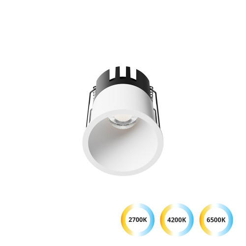 Stylish LED recessed downlight lamp from the series Dylan, made of a white colour round aluminium body, recessed inward with a light scattering angle: 36º and power: 7W, LED with the ability to select the colour temperature: 2700K/4200K/6500K via a switch. The body has an included LED driver. Modern proposal for interior lighting in your home, office, hotel and restaurant.