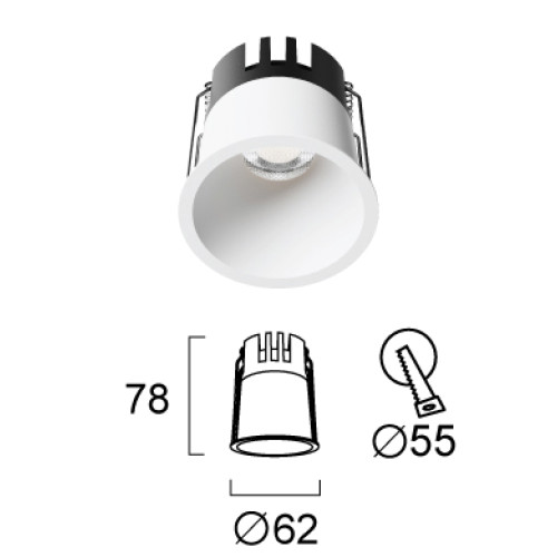 Dimensions: Diameter: 62mm, Depth: 78mm, Recessed diameter: 55mm