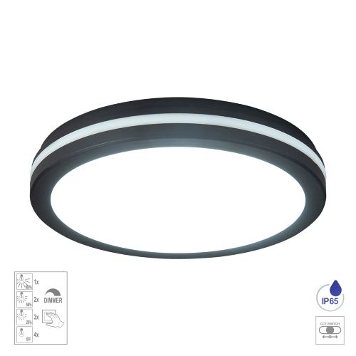 Attractive LED facade ceiling lamp with stylish design from series Famo, made of black colour plastic body in a cylindrical shape with white plastic diffuser, with integrate 20W LED, 3000K - 6000K, 2000lm, with high ingrress protection: IP65. The modern choice for the lighting in your facade, corridor and terrace.
