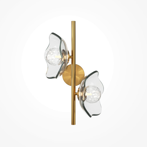 Modern wall lamp from the series Miracle, made of a brass colour metal base with straight arm and two transparent glass shades with an elegant shape on a G9 socket. Stylish proposal for comfortable lighting in your living room, bedroom, hotel and restaurant.