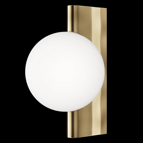Elegant wall lamp with an original design from the series Avant-garde, made of brass colour rectangular metal base and white colour spherical glass shade. A modern design proposal for cozy lighting in your living room, bedroom, corridor, hotel and restaurant.