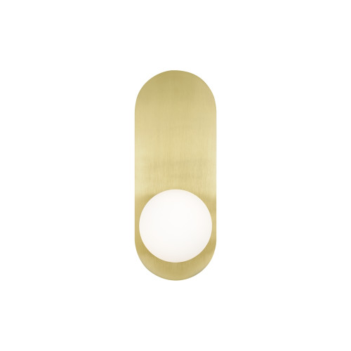 Modern wall lamp from the series Bao, made of a gold colour oval metal base and a matt white glass diffuser in a spherical shape. Stylish solution for the comfortable and cozy lighting of your living room, bedroom, corridor, hotel and restaurant.