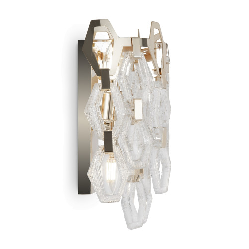 Stylish wall lamp with an exquisite design from the series Tissage, made of a gold colour rectangular metal base and an original diffuser composed of metal plates and transparent textured glass pendants with a geometric shape. A magnificent proposal for interior lighting in your living room, dining room, bedroom, corridor, hotel and restaurant.