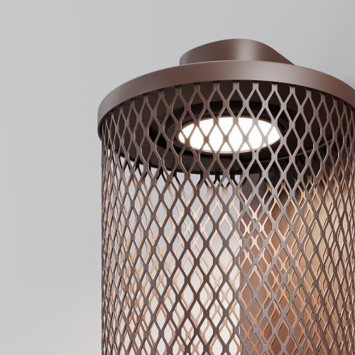Stylish LED facade wall lamp from the series Latticea, made of a brown colour aluminium base and a cylindrical aluminium shade as a grid with a built-in 6W 3000K LED and a high degree of ingress protection: IP54. Modern proposal for quality lighting of the garden, facade, terrace and veranda in your home, hotel or restaurant.