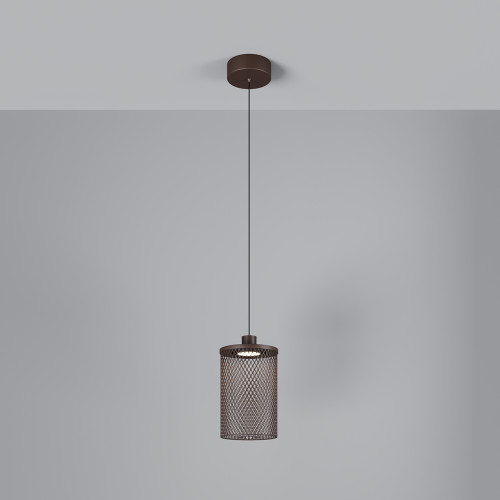 Stylish LED garden pendant lamp from the series Latticea, made of a brown colour aluminium base and a cylindrical aluminium shade as a grid with a built-in 6W 3000K LED and a high degree of ingress protection: IP54. Modern proposal for quality lighting of the garden, facade, terrace and veranda in your home, hotel or restaurant.