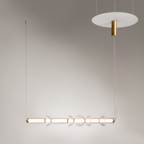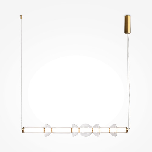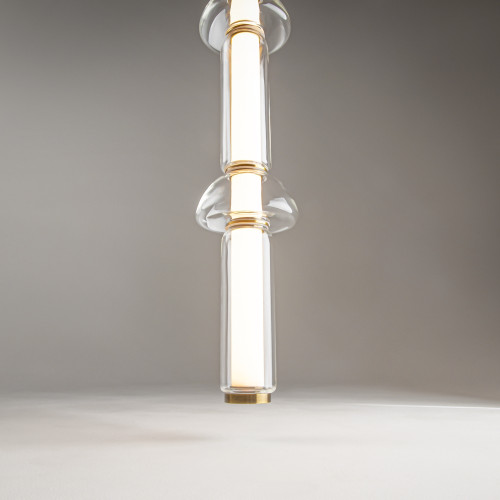Stylish LED pendant lamp with a modern design from the series Cosmo, made of a brass colour metal base and a hanging horizontal or vertical body made of transparent glass elements with a built-in 39W 3000K LED. Attractive lamp that will give modern style and comfortable light to your living room, dining room, bedroom, hotel and restaurant.