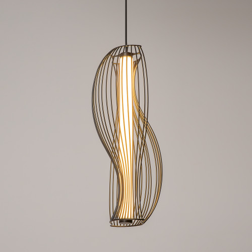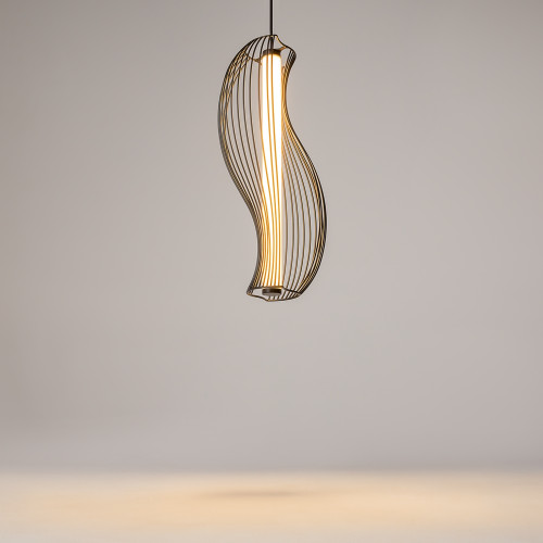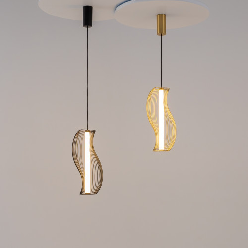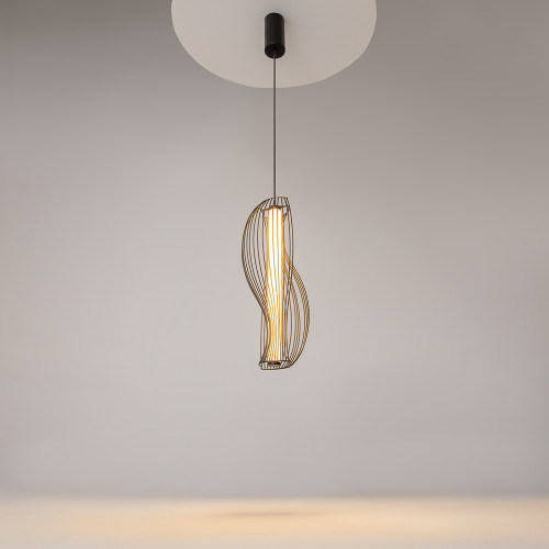 Original LED pendant lamp from the series Shadows of the past, made of black colour metal base and asymmetrical metal wire shade with frosted plastic diffuser and built-in 20W LED, 3000K. Modern proposal for comfortable lighting in your living room, dining room, bedroom, hotel or restaurant.