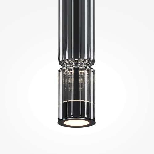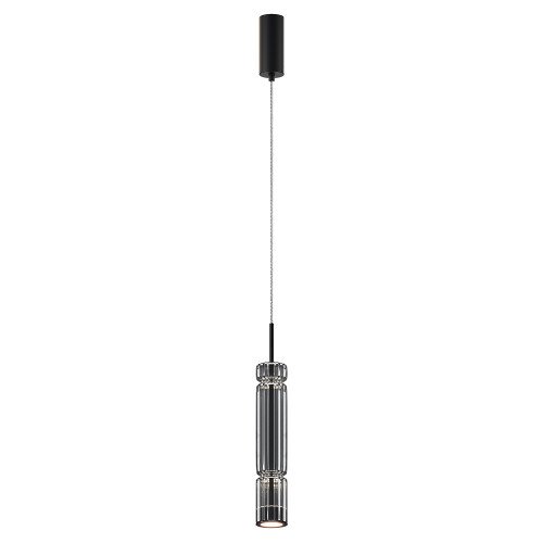 Original LED pendant lamp with a stylish design from the series Ordo, made of a black colour metal base and a cylindrical glass shade with a vertical embossed pattern in smoky colour and a built-in 12W 3000K LED. Modern lamp, suitable for quality and comfortable lighting in your dining room, kitchen, bedroom, hotel and restaurant.