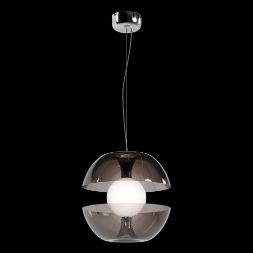 Stylish LED pendant lamp with an attractive design from the series Rebel, made of a chrome colour metal base with a white spherical glass diffuser and two hemispherical decorative glass shades in smoked colour. A modern proposal for interior lighting in your living room, dining room, bedroom, hotel or restaurant.