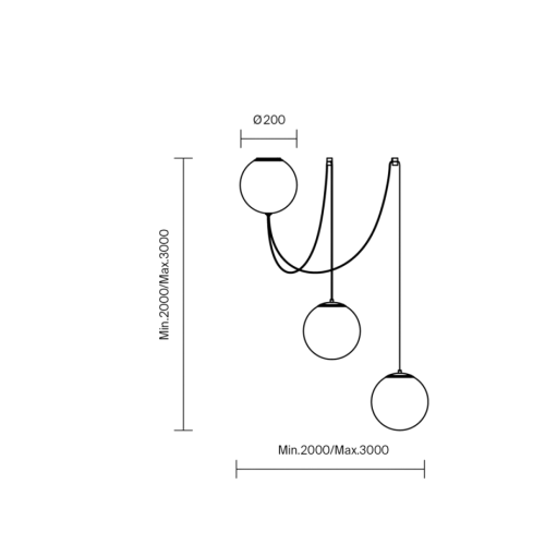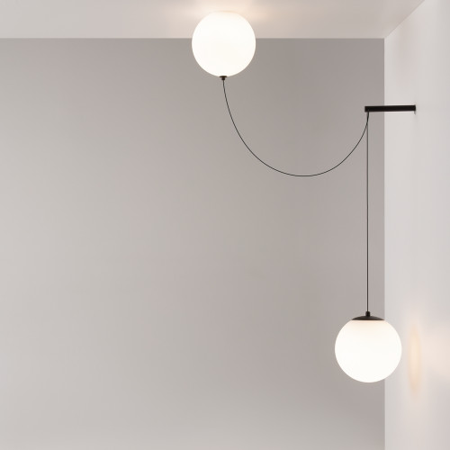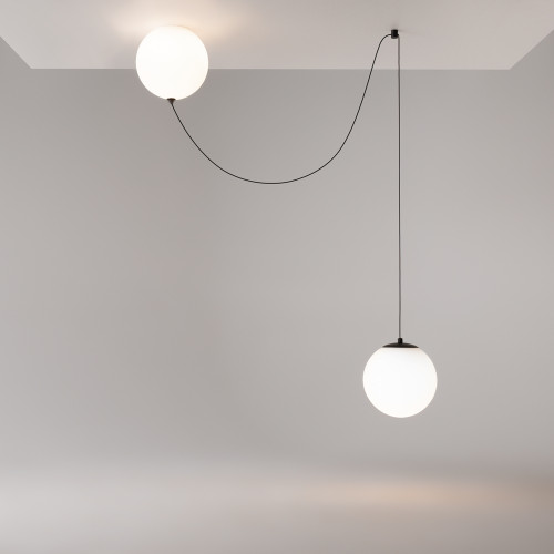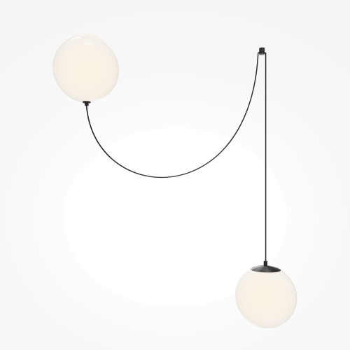 Modern with minimalism design LED pendant lamp from the series Twins, made of three matt white colour spherical glass shades with built-in 2 x 10W, 3000K LED, 1400lm, beam angle: 120 degree, with black colour textile cable. Pendant lampy from designer Alexey Dinilin. Stylish hanging lamp that will fill with quality light and comfort your living room, dining room, bedroom, hotel and restaurant.
