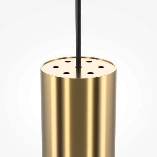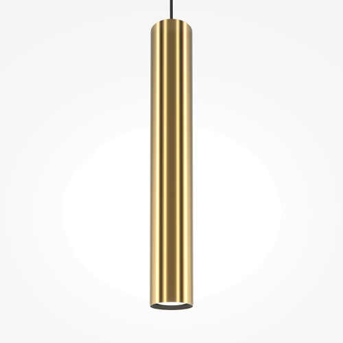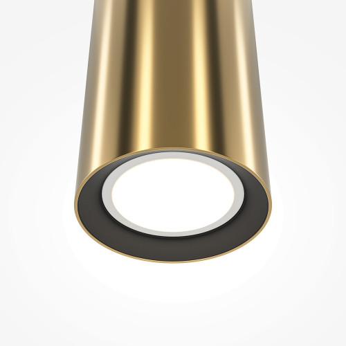 Stylish pendant lamp with clean shapes from the series Pro Focus, made of a brass colour round aluminium base and a cylindrical aluminium body on a GU10 socket. Modern proposal for interior lighting in your home, hotel, office and restaurant.