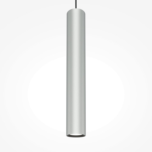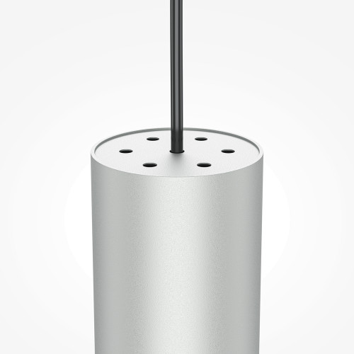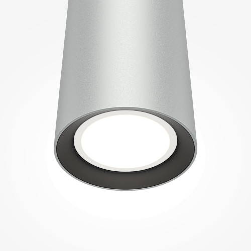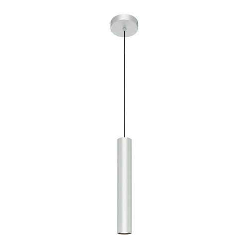 Stylish pendant lamp with clean shapes from the series Pro Focus, made of a silver colour round aluminium base and a cylindrical aluminium body on a GU10 socket. Modern proposal for interior lighting in your home, hotel, office and restaurant.