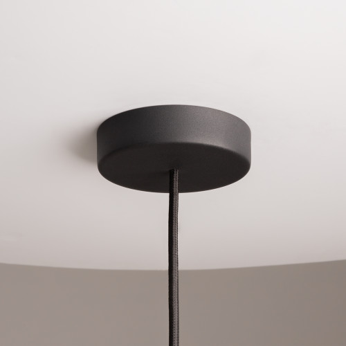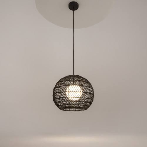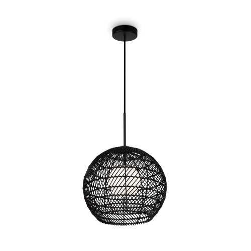 Attractive pendant lamp with a stylish design from the series Cane, made of a black colour metal base and a matt white spherical glass diffuser, covered with a decorative shade of braided fiber threads in black colour. Modern hanging lamp, suitable for the comfortable and original lighting in your living room, dining room, bedroom, hotel and restaurant.