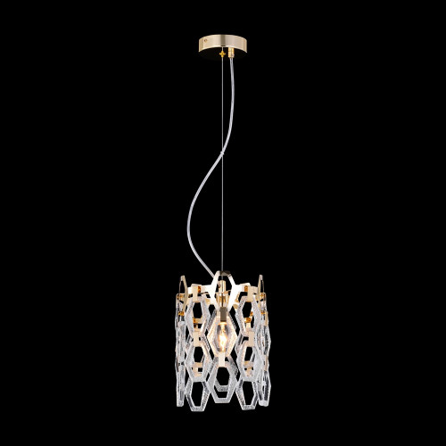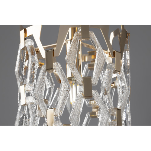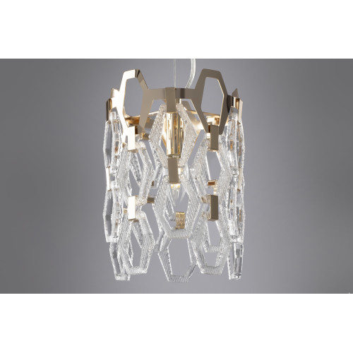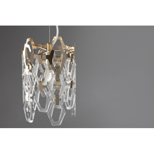 Stylish pendant lamp with an exquisite design from the series Tissage, made of a gold colour round metal base and an original shade composed of metal plates and transparent textured glass pendants with a geometric shape. A great offer for interior lighting in your living room, dining room, bedroom, hotel and restaurant.