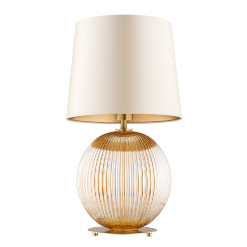 Stylish table lamp from the series Hamilton, made of brass base with copper colour glass body in spherical shape and textile shade in beige colour on the outside and gold on the inside. A great addition to the cozy lighting of your living room, dining room, bedroom, office, hotel and restaurant.