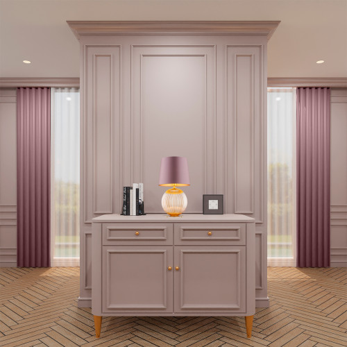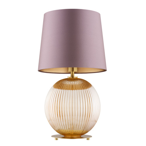 Stylish table lamp from the series Hamilton, made of brass base with copper colour glass body in spherical shape and textile shade in pink colour on the outside and gold on the inside. A great addition to the cozy lighting of your living room, dining room, bedroom, office, hotel and restaurant.