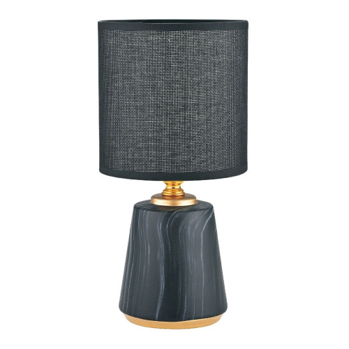 Stylish table lamp, made of brass colour base and black ceramic body with black colour textile shade in cylindrical shape. Great addition to the interior lighting of your living room, dining room, bedroom, office, hotel or restaurant.