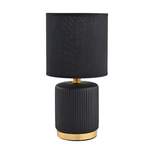 Stylish table lamp, made of brass colour base and black ceramic body with black colour textile shade in cylindrical shape. Great addition to the interior lighting of your living room, dining room, bedroom, office, hotel or restaurant.