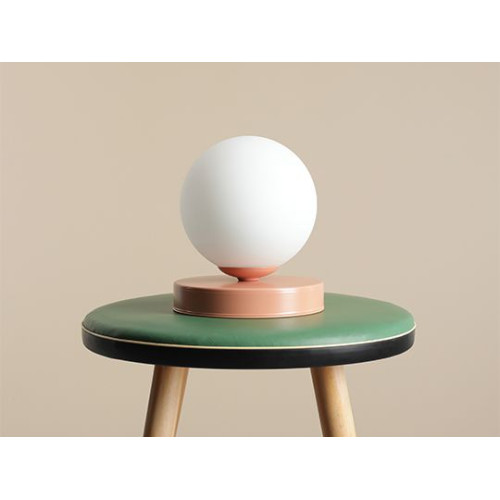 Stylish table lamp from the series Ball, made of a coral colour round metal base and a matt white glass shade in a spherical shape on an E14 socket. Modern proposal for the cozy lighting of your living room, dining room, bedroom, hotel and restaurant.