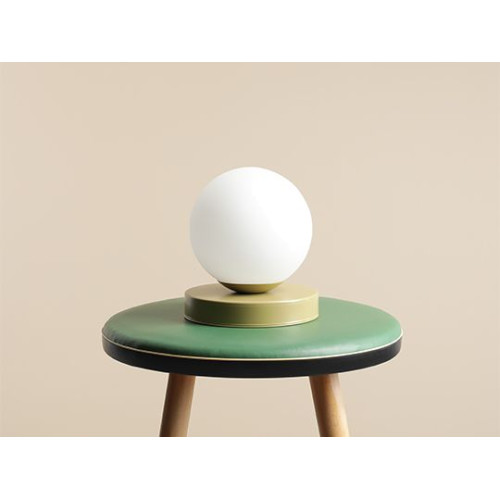 Stylish table lamp from the series Ball, made of a pistachio colour round metal base and a matt white glass shade in a spherical shape on an E14 socket. Modern proposal for the cozy lighting of your living room, dining room, bedroom, hotel and restaurant.