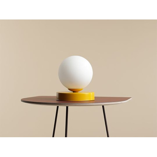Stylish table lamp from the series Ball, made of a yellow colour round metal base and a matt white glass shade in a spherical shape on an E14 socket. Modern proposal for the cozy lighting of your living room, dining room, bedroom, hotel and restaurant.