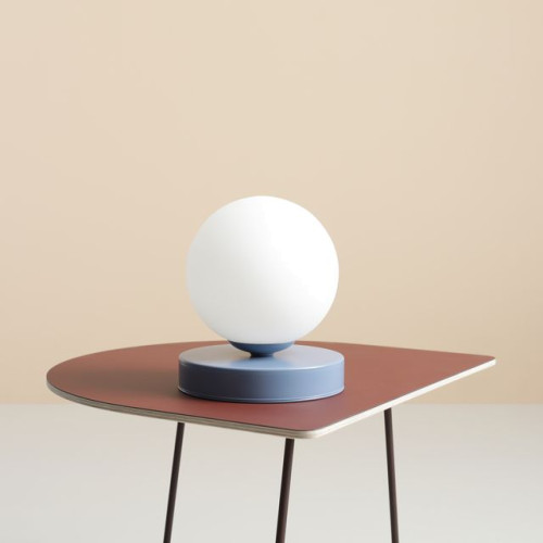 Stylish table lamp from the series Ball, made of a blue colour round metal base and a matt white glass shade in a spherical shape on an E14 socket. Modern proposal for the cozy lighting of your living room, dining room, bedroom, hotel and restaurant.