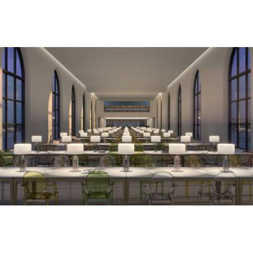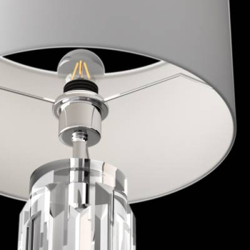 Stylish table lamp with modern design from the series Muse, made of transparent sculpted glass base with chromed metal arm and white cylindrical textile shade. An original addition to the lighting of your living room, dining room, bedroom, office, hotel or restaurant.