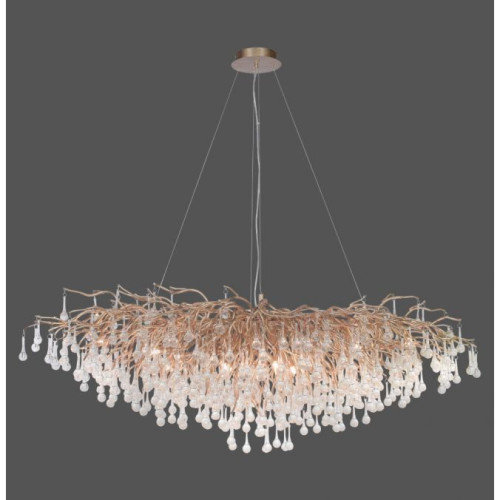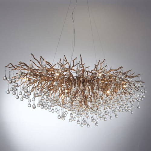 Magnificent chandelier with a stylish design from the series Icicle, made of a antique brass colour metal base and an original body, consisting of branched metal strands with sparkling clear crystal pendants. A luxurious lamp that will fill your living room, dining room, bedroom, lobby, hotel and restaurant with brilliance and a comfortable atmosphere.