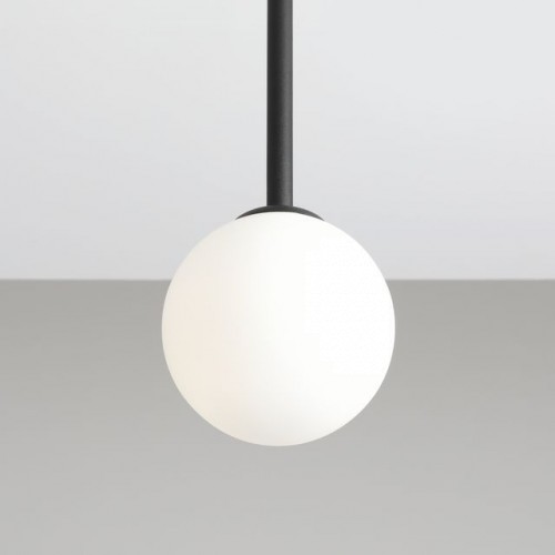 Modern pendant lamp with a minimalist design from the series Pinne, made of a black colour metal base with an arm and a white spherical glass shade on an E14 socket. An original proposal for comfortable and stylish lighting for your living room, dining room, bedroom, office, hotel and restaurant.
