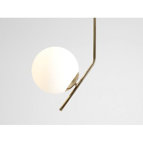 Original pendant lamp with a modern design from the series Gallia, made of a gold colour metal base and an arm with a matt white spherical glass shade on an E27 socket. Stylish solution for comfortable lighting in your living room, dining room, bedroom, hotel and restaurant.