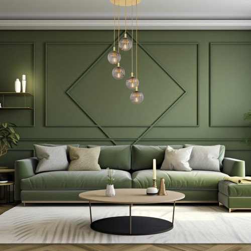 Stylish pendant lamp from the series Paloma, made of round brass base and five spherical shades of smoked ribbed glass hanging at different heights. A sophisticated proposal for the quality and comfortable lighting of your living room, dining room, bedroom, hotel and restaurant.