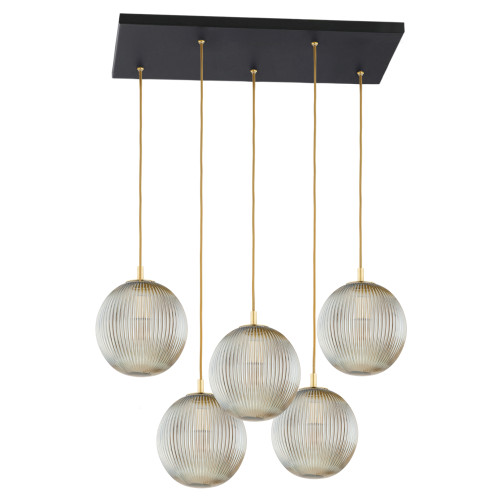 Stylish pendant lamp from the series Paloma, made of black colour metal base and five spherical shaped shades of grey fluted glass. A sophisticated proposal for the quality and comfortable lighting of your living room, dining room, bedroom, hotel and restaurant.