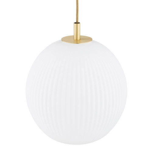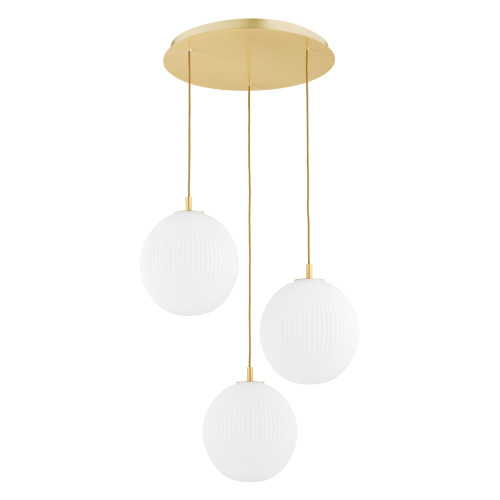 Stylish pendant lamp from the series Paloma, made of round brass base and three spherical shades of opal matt ribbed glass hanging at different heights. A sophisticated proposal for the quality and comfortable lighting of your living room, dining room, bedroom, hotel and restaurant.