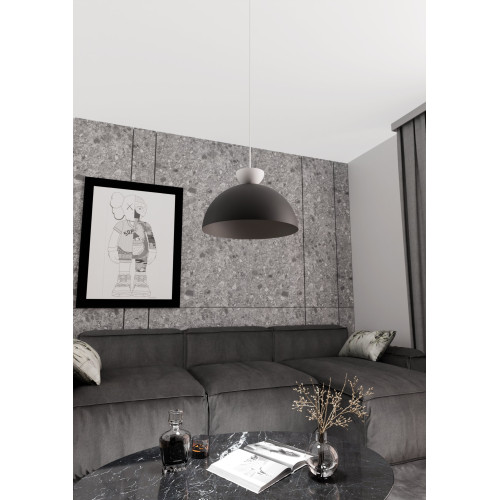 Modern pendant lamp with a stylish design from the series Lunaro, made of a black colour metal base and a hemispherical black metal shade with a white decorative element on top. Quality hanging lamp, suitable for the interior lighting of your living room, dining room, bedroom, hotel and restaurant.