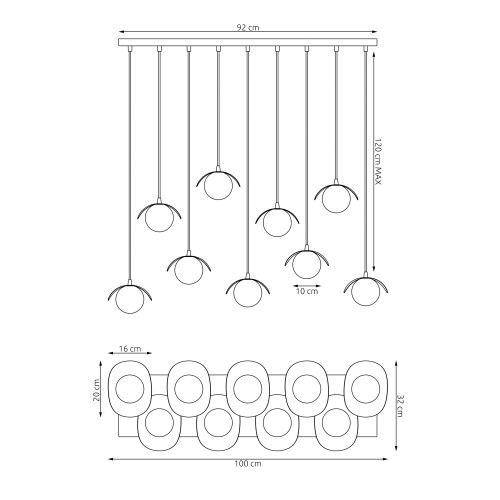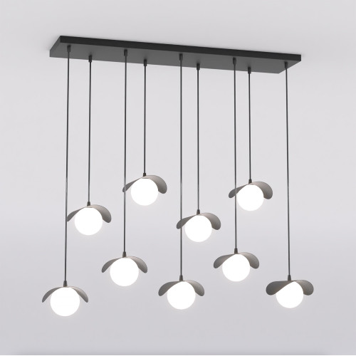 Modern pendant lamp with minimalist design from the series Ritual, made of black colour metal base and nine curved metal shades with opal glass spherical diffusers. An original solution for interior lighting in your living room, dining room, hotel and restaurant.
