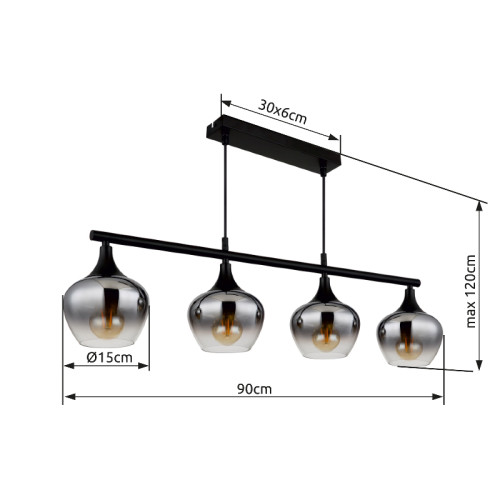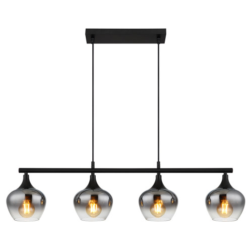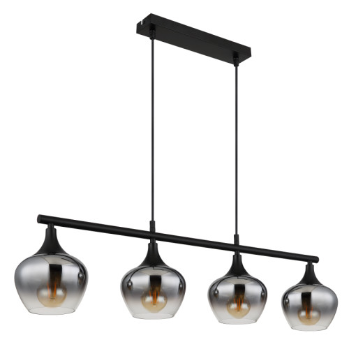 Elegant pendant lamp with a modern design from the series Maxy, made of a black colour metal base and four dome-shaped glass shades in a smoked colour that fades to transparent. An original solution for interior lighting in your living room, dining room, hotel and restaurant.
