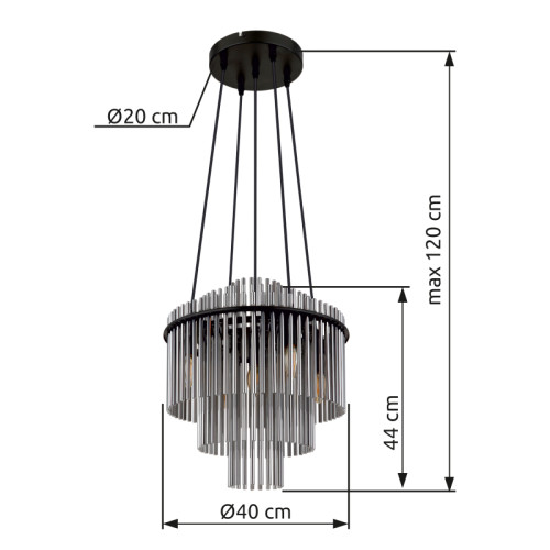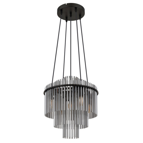 Stylish pendant lamp with a sophisticated design from the series Gorley, made of a matt black colour metal base and cylindrical decorative shade on three levels of smoked glass rods. Great suggestion for comfortable lighting in your living room, dining room, hotel and restaurant.