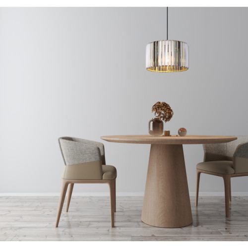 Stylish pendant lamp from the series Run, made of a metal base imitating wood and cylindrical shade of smoked crystals. Modern proposal for the comfortable lighting of your living room, dining room, bedroom, hotel and restaurant.