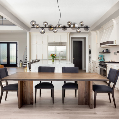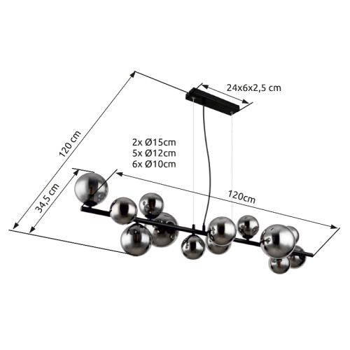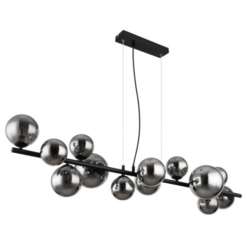 Modern pendant lamp with a stylish design from the series Riha, made of a black colour metal base and a metal arm with thirteen spherical glass shades in smoked colour. An original proposal for comfortable lighting in your living room, dining room, hotel and restaurant.