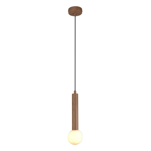 Modern pendant lamp with a minimalist design from the series Filano, made of a brown colour, imitating natural wood metal base and cylindrical metal body with opal glass diffuser in a spherical shape. Stylish solution for lighting your living room, dining room, bedroom, hotel and restaurant.