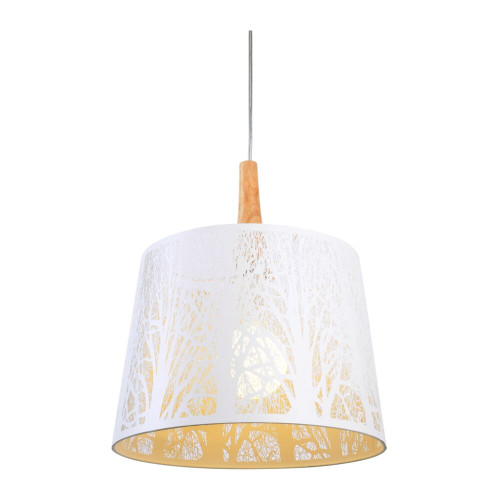 Stylish pendant lamp with an original design, made of a white colour metal base with a wooden decorative detail and a white metal shade with screen printing depicting tree crowns. Modern hanging lamp, suitable for the quality and cozy lighting of your living room, dining room, bedroom, hotel and restaurant.