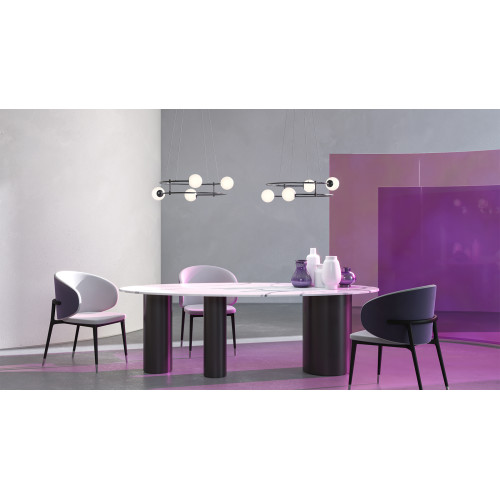 Modern pendant lamp from the series Balance, made of black colour round metal base and hanging curved asymmetrical metal body on three levels with six spherical white opal glass shades. Stylish hanging lamp, suitable for comfortable lighting in your living room, dining room, hotel and restaurant.