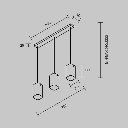 Dimensions: Height: 260-2300mm, Height of the shades: 180mm, Width: 102mm, Length: 702mm