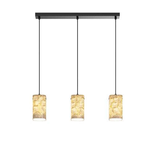 Original pendant lamp with a stylish design from the series Maris, made of a black colour metal base and three rectangular shades with rounded edges made of white seashells. Modern proposal for the interior lighting of your living room, dining room, bedroom, hotel and restaurant.