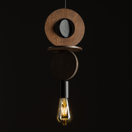 Original pendant lamp from the series Drops Wood, made of a black colour metal base with a decorative body made of brown plywood and a bulb holder on an E27 socket. Hanging lamp, suitable for cozy and comfortable lighting in your living room, dining room, bedroom, hotel and restaurant.